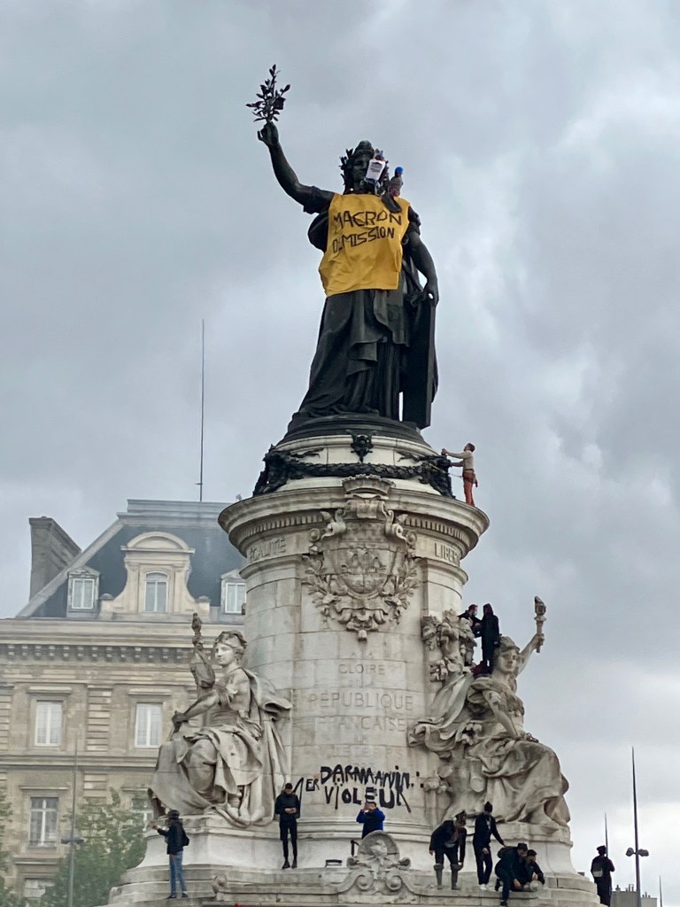 I can witness to the crowd I milled with shortly past noon at Place de Republique, beginning of the demo: a few hundred. Over the next hours it would grow not only in size, but in violence. The initial ambiance of a popular celebration turned dark—black, in fact—after I had wandered off to find shelter from a sudden thunder burst, looking over my shoulder, fearing for the safety of the daredevils crawling up the immense statue of Dame Republic. (See photo.)